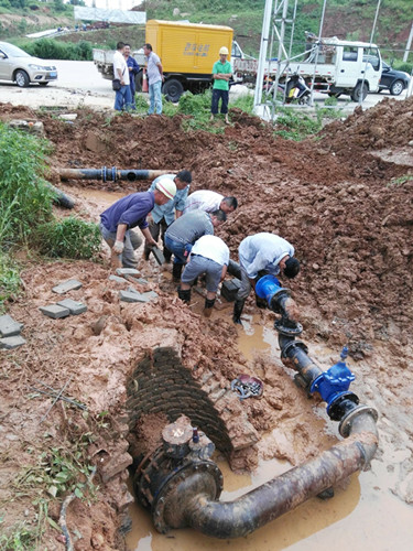 水務集團按照城投公司“全力保障受災群眾生活”的部署要求,選派干部帶隊,抽調骨干立即趕赴現場,經勘查后迅速確定啟用開發(fā)區(qū)新裝的DN400管道。施工人員克服暴雨如注、深夜施工等困難,經過10多個小時的連續(xù)奮戰(zhàn),至7月3日18時,管道沖洗后水質經檢驗合格,于晚上21時正式通水,保證了周邊企業(yè)和村民的生產生活用水,受到了當地政府和居民群眾的贊揚。