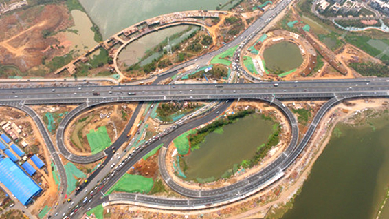 野芷湖立交橋作為連接三環(huán)線與南大門的重要交通樞紐,原有的4股上下橋匝道已無法滿足日益增加的車流量,成為當(dāng)?shù)亟煌ǖ摹澳c梗阻”。集團(tuán)公司投資建設(shè)的新野芷湖立交橋是其中重要的節(jié)點(diǎn)工程,將建成全市第一座分離式集散車道的樞紐立交,其中南北兩側(cè)共計(jì)4條匝道在改造后將變成南北各4條匝道,同時(shí)在三環(huán)線上增加幫寬橋,使單側(cè)橋面寬度增加2車道,專門用于分流下行匝道車輛,較好地起到行車疏導(dǎo)作用。
