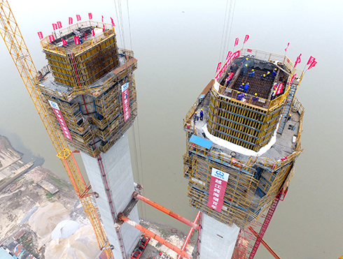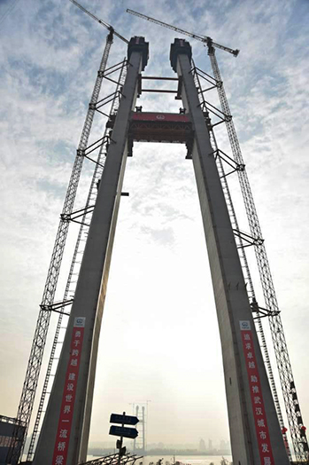此次完成封頂?shù)?#主塔位于漢陽(yáng)側(cè)江灘,主塔呈下寬上窄的漸變式構(gòu)造,與長(zhǎng)江對(duì)岸的2#主塔隔江相望。主塔基礎(chǔ)為沉井基礎(chǔ),塔柱施工內(nèi)容主要包括塔座、塔柱、中橫梁和上橫梁及附屬結(jié)構(gòu)。主塔塔身和上橫梁采用鋼筋混凝土結(jié)構(gòu),中橫梁采用預(yù)應(yīng)力混凝土結(jié)構(gòu)。主塔高231米,共分38節(jié)。兩塔柱的橫向中心距,塔頂為28米,塔底為38米。塔身共澆筑混凝土2.8萬(wàn)立方米,耗用鋼材4820噸。