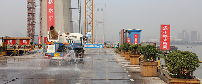 工程代建單位道橋公司有關負責人介紹:“我們這個工地的特點就是綠色環(huán)保,對揚塵嚴格控制,通過營造景觀、種植樹木提高工地的‘顏值’,讓工地變成花園。”在武昌岸的施工現(xiàn)場,花草樹木都被搬上了臨時搭建的鋼棧橋。為了提高花草樹木成活率,特別選用了成活率高的黃楊球、鐵樹等,并按照季節(jié)更換花草,還安裝了自動灌溉系統(tǒng)。