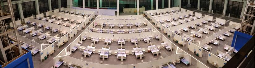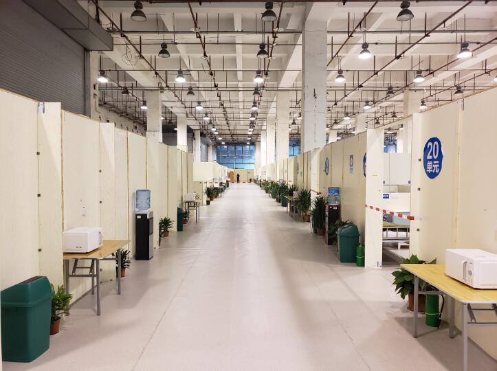 15日完成上下兩層病患區(qū)共1047個床位隔斷、給排水、供電、通信、監(jiān)控、化糞池等主體功能,16日物資采購基本到位,“方艙”生活用品、衛(wèi)生間、洗漱、淋浴、空調(diào)取暖、熱水器、醫(yī)廢收集等功能配套安裝布設到位。緊接著,邀請中央、省、市三級疾控專家現(xiàn)場指導,“三區(qū)兩通道”、新風系統(tǒng)等逐步完善。建設者們克服一切困難,一周時間內(nèi)建成這座方艙醫(yī)院。市指揮部原下達1000張床位任務,為盡力發(fā)揮功效,最終擴為1047個。