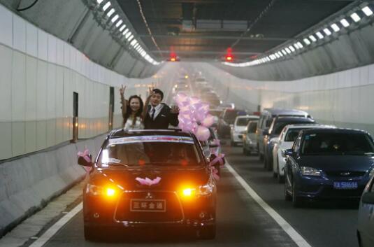 2008年12月28日,武漢長江隧道通車,一對新人途經(jīng)隧道駛向幸福生活。